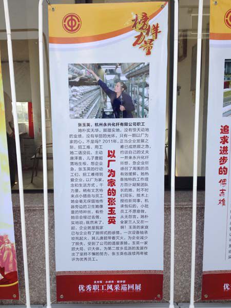 5月3日,瓜沥镇优秀职工风采巡回展在我公司展出。其中,最引人注目的是我公司加弹车间员工张玉英。张玉英一家三口都在本公司上班,平时工作勤勤恳恳,顾全大局。连续两年被企业评为优秀员工。